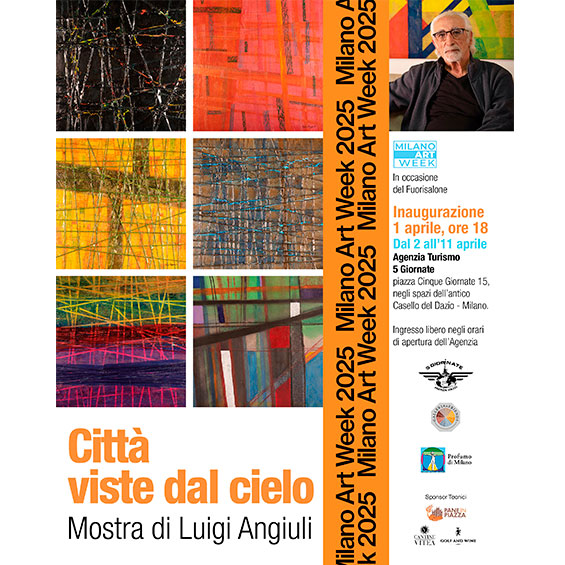 l’Agenzia di turismo 5 Giornate in occasione della Milano Art Week organizza la mostra di Luigi Angiuli con le sue “Città viste dal cielo”, inconfondibili planimetrie che, tramite la libera composizione di forme e colori, esprimono le peculiarità urbanistiche contemporanee con quell’amalgama di grandi vie, piccoli spazi, intersezioni quasi clandestine e vie private che sono specchio dell’animo umano.